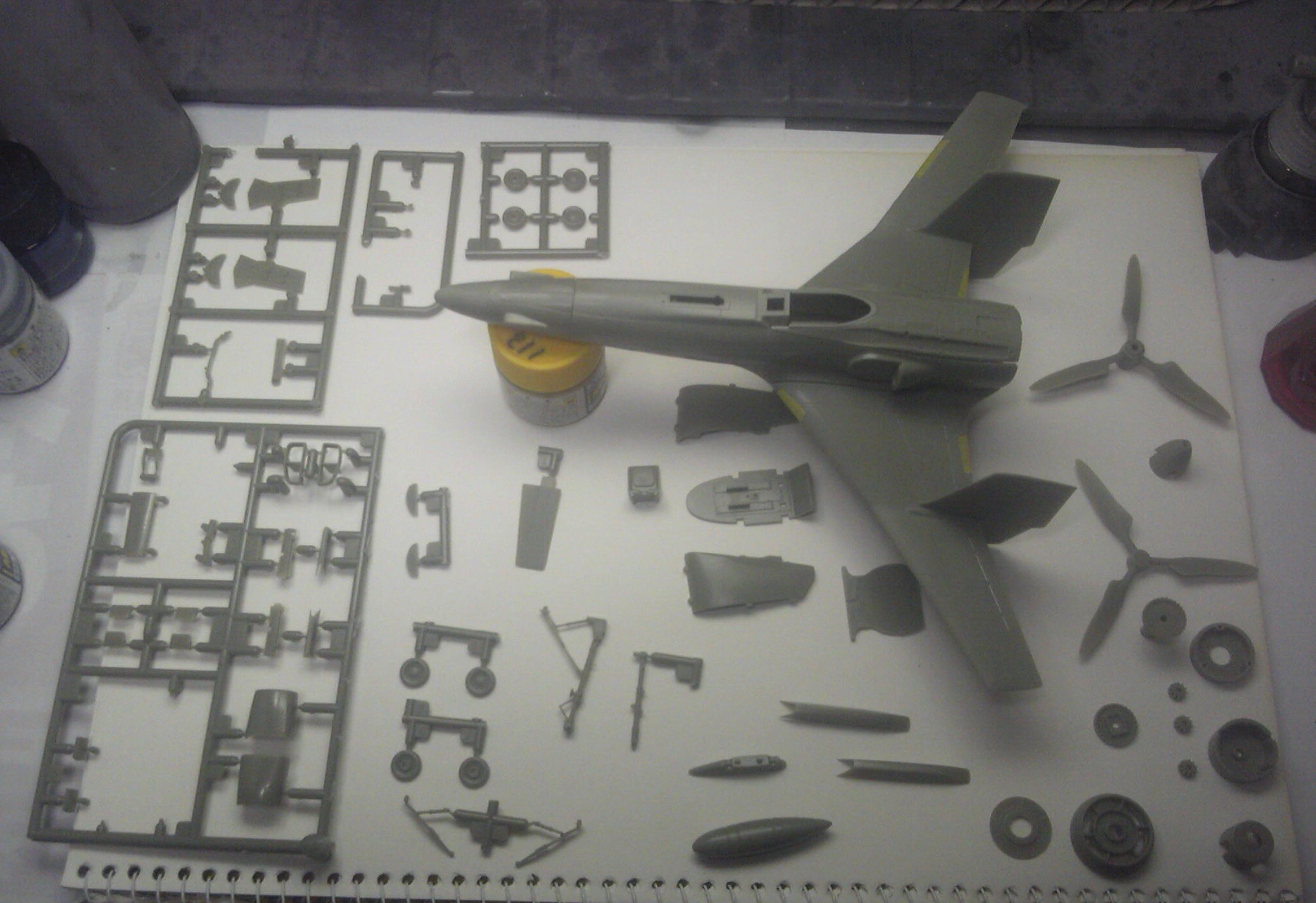 合わせ目消し、一部スジ彫りを彫り直し、左右主翼の接着に一工夫が必要になりそうです。