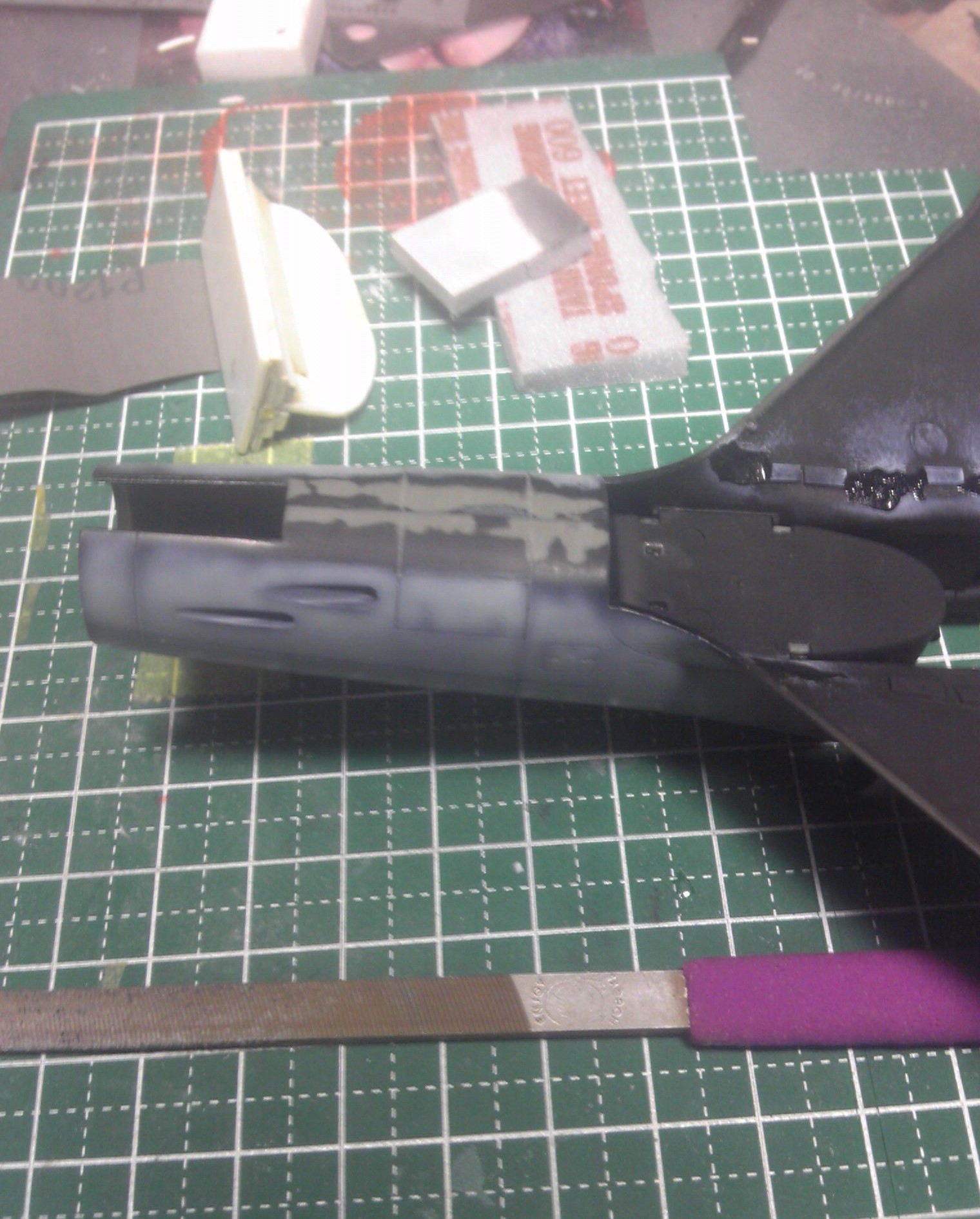 画像をよくみるとプラ材のグレー、下塗りの黒、基本塗装のグレーが同一面上に確認出来ますね…それだけ処理前は面が波打っていたワケですね。