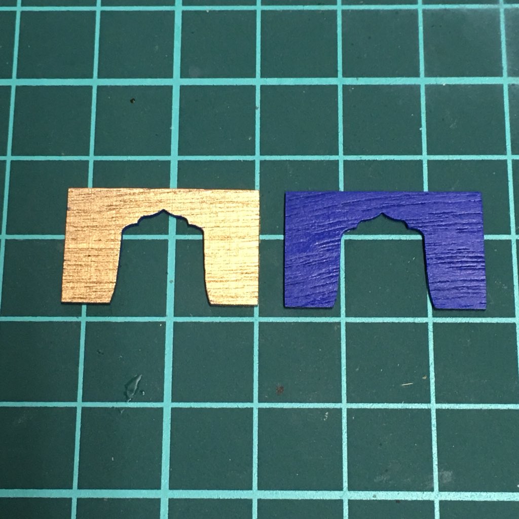 天主パーツの塗装終了して組立てに入ります。全てのパーツが、裏表を別々に塗装になります。 ゴールドについては、説明書にある金スプレーでは発色に乏しいため、黒下地からメタリックを4重に重ね吹きして発色良くしております。 群青色に関しては、説明書のコバルトブルーとパープルの混色を下地にしておりますが、現地取材を元にクリアーレッドをちょい足しして調整してます。全てのパーツ色分けはマスキングしてのブラシ塗装です。細かな柱の塗り分けも全部です。 これから組立てに入ります