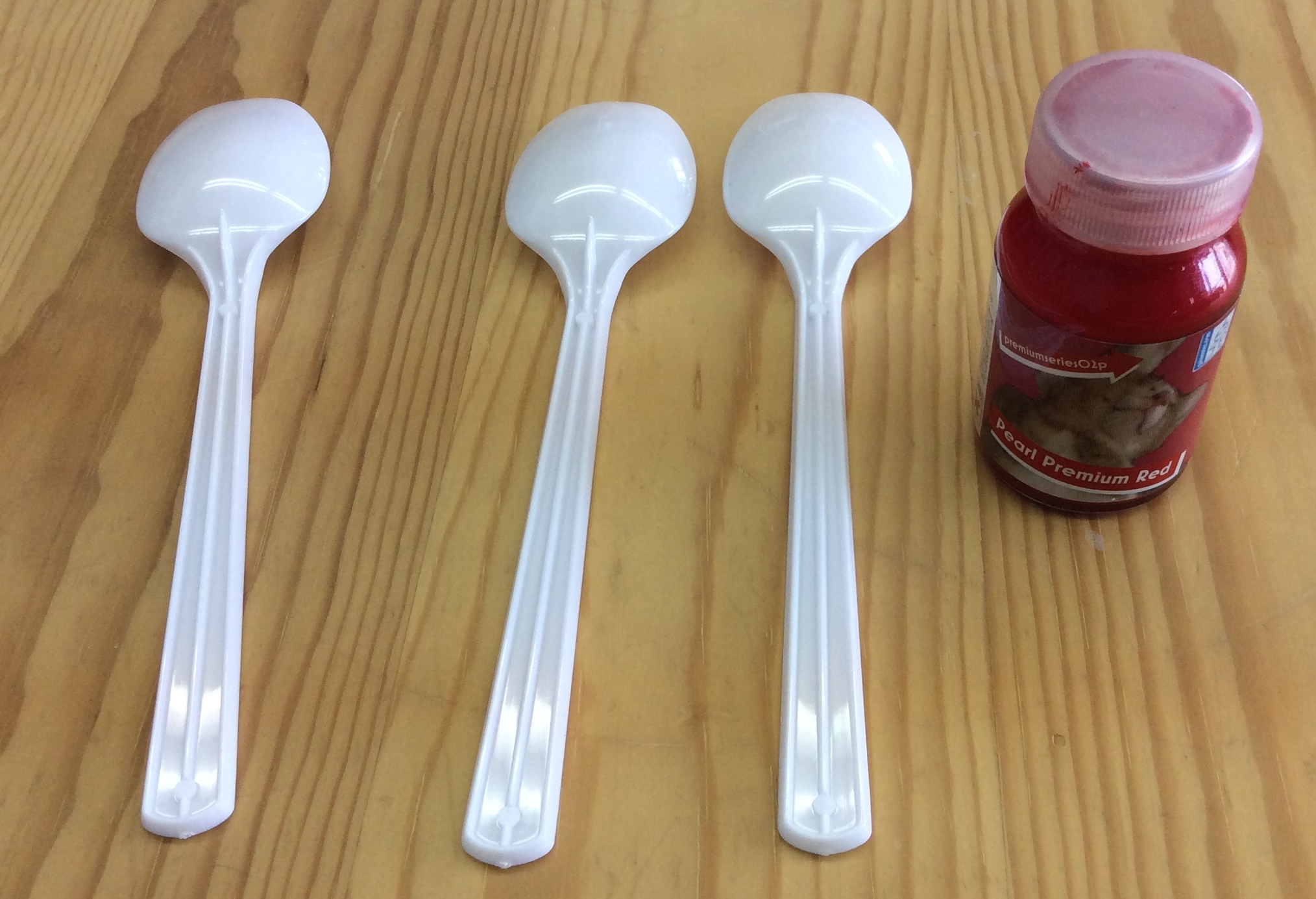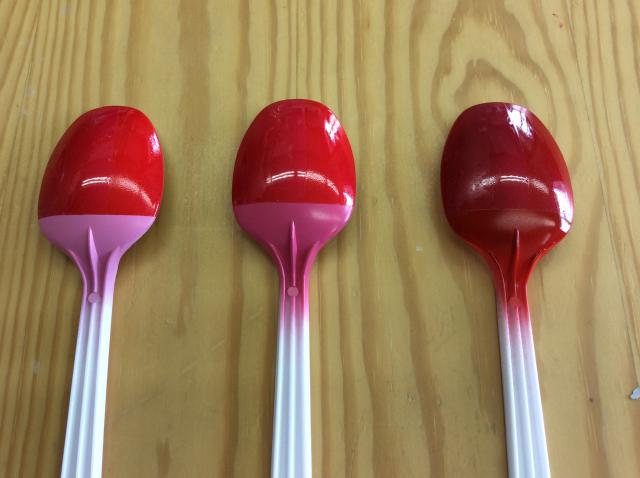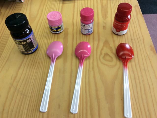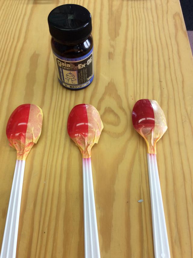 スプーン左側が蛍光クリアのみ 中央は 蛍光クリアにクレオスクリア 右側はクレオスクリアのみ